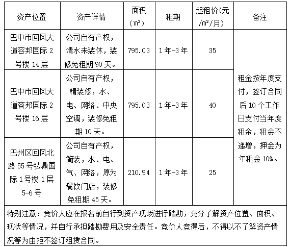 根據(jù)國有資產(chǎn)管理相關(guān)規(guī)定,巴中自然資源投資集團有限公司決定對相關(guān)資產(chǎn)進行公開招租。現(xiàn)將有關(guān)事項公告如下: